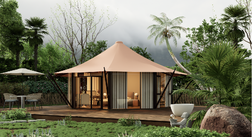主材:优质碳钢钢管+圆管支撑(氟碳漆防锈处理) 外膜:PVDF优质膜材 内膜:PVC 墙体:双层中空玻璃 规格:3m8边套内面积:44㎡ 投影面积:63.07㎡ 抗风等级:10级以下